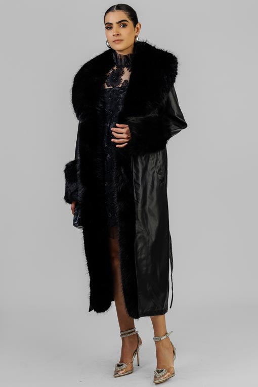Abrigo largo en tono negro con un diseño sofisticado que combina piel sintética de alta densidad en el cuello y en los puños con un cuerpo de acabado tipo cuero, creando un contraste lujoso y moderno. Su textura suave y voluminosa aporta un aire majestuoso.