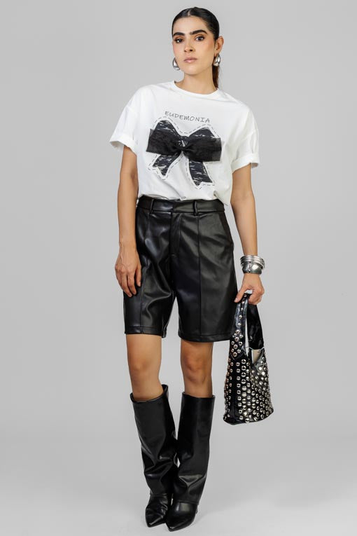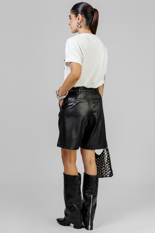 Bermuda vinipiel, pretina lisa, cierre y botón al frente, bolsas al costado, corte bajo recto