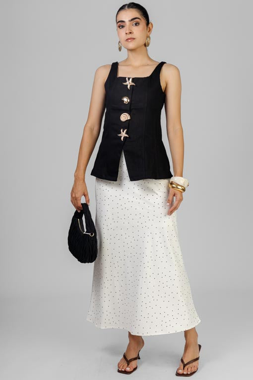 Blusa tirante ancho, cierre por la espalda, botones decorativos al frente