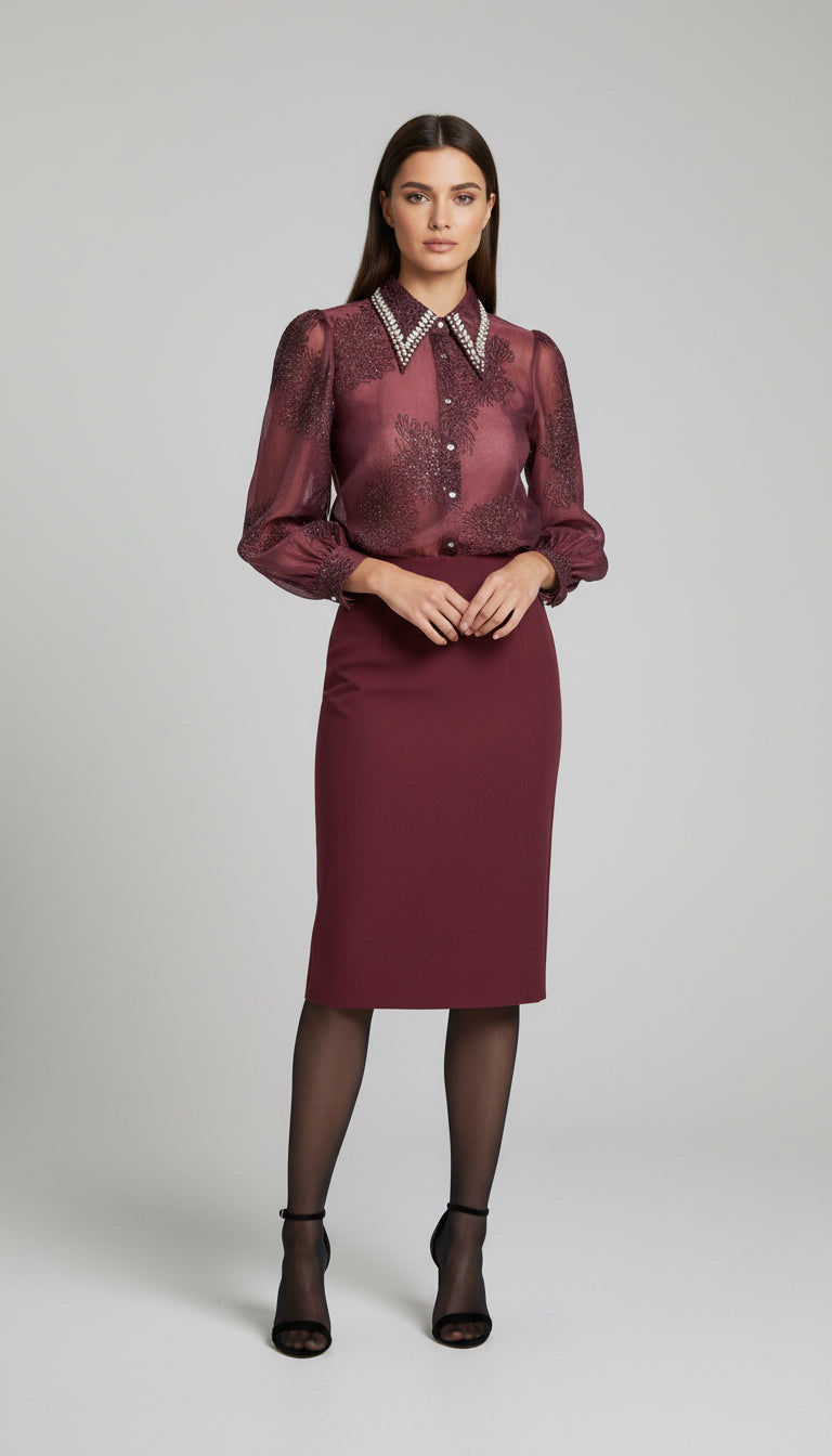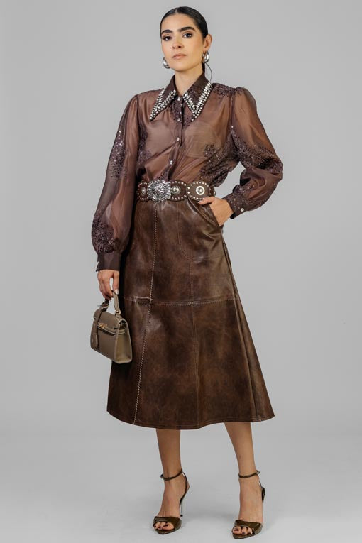 Blusa camisero cuello americano con detalles de cristales, botones al frente, manga larga con puños, corte bajo recto