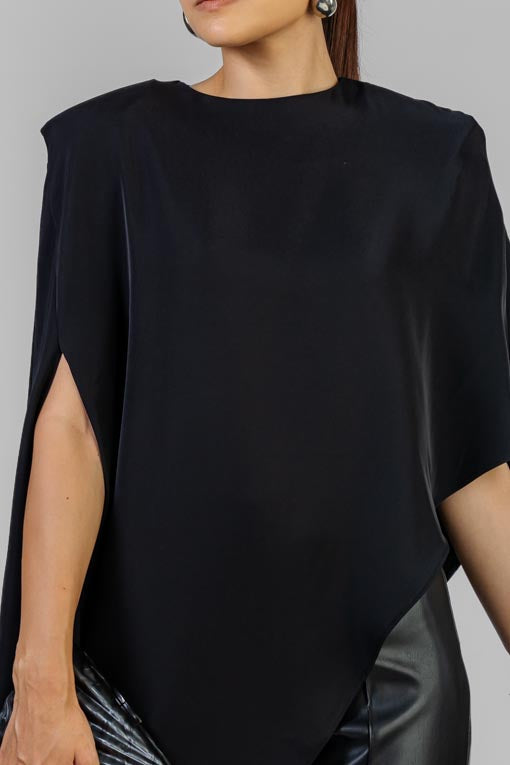 Blusa negra de diseño elegante con corte asimétrico tipo capa, que cae enuna caída fluida y sofisticada sobre un solo lado. Su cuello cerrado aporta un toque minimalista y moderno, cierre por la espalda. Perfecta para eventos formales o para elevar cualquier look con un aire de misterio y glamour