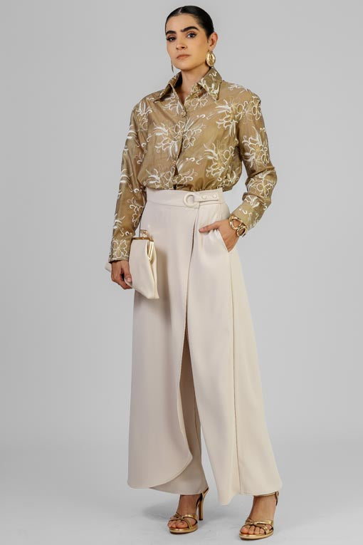 Blusa de manga larga en tono biege olivo con un acabado ligeramente satinado que le da un toque elegante y artesanal. Pesenta un bordados floral blanco con detalles dorados, creando un contraste delicado y muy femenino. El diseño incluye cuello clásico, botones frontales decorativos y un corte recto que favorece