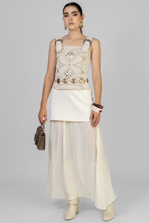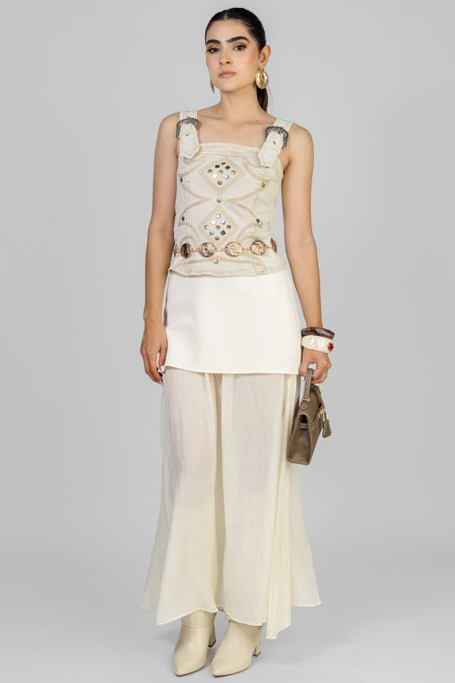 Blusa mezclilla, tirante ancho ajustable con hebillas, escote cuadrado, cierre por la espalda, detalle de bordados y estoperoles al frente