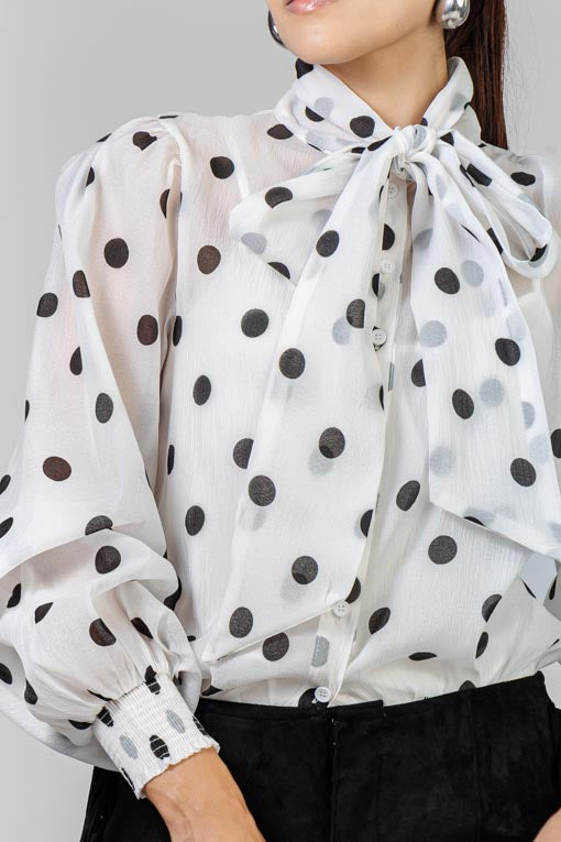Blusa lazada al cuello. botones al frente, manga larga con puños de elástico, blusa interior tirante delgado, corte bajo recto