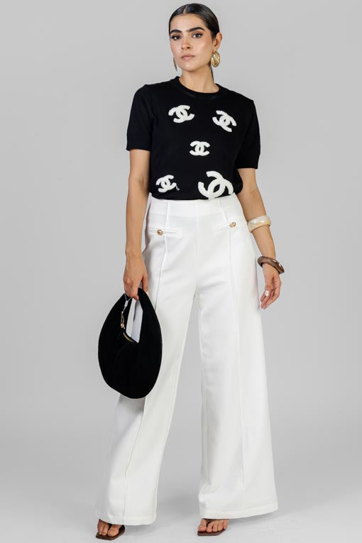 Blusa tejido ligero, escote redondo, manga corta, detalle de logos al frente