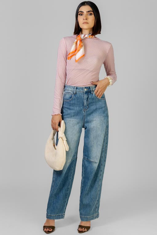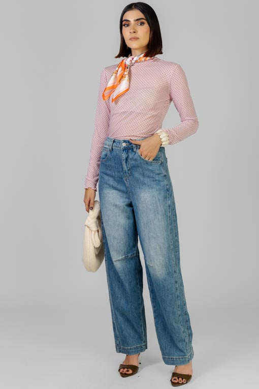Su diseño destaca por el estampado de pequeños lunares que aportan un toque coqueto y atemporal. El acabado ondulado en el borde inferior y en los puños añade un detalle delicado que le da movimiento y un aire moderno a la prenda.