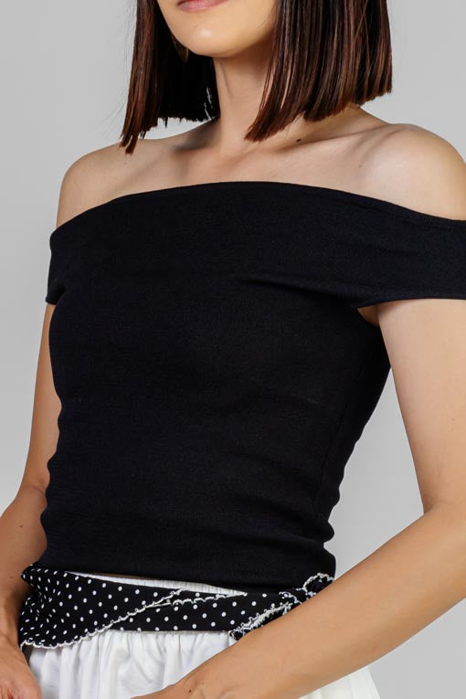 Blusa de punto ligero con diseño minimalista y silueta ajsutada que se adapta al cuerpo. Escote recto con corte ligeramente off shoulder que enmarca hombros y cuello de forma elegante. Tejido con tectura sutil que aporta estructura sin perder comodidad. Largo ideal para llevar por dentro o suelta