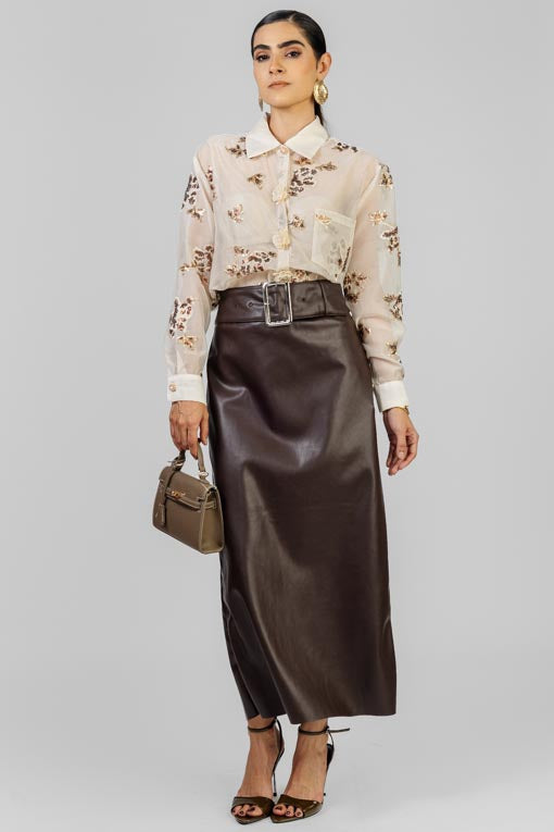 Blusa cuello camisero, botones al frente, manga larga, detalle de lentejuelas en todo el cuerpo
