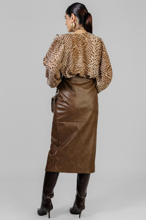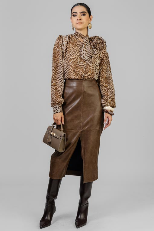 Blusa botones al frente, detalle de broche de flor y lazada, manga larga, corte bajo recto