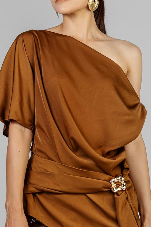 Blusa una manga con escote drapeado, detalle de broche al costado con lazada