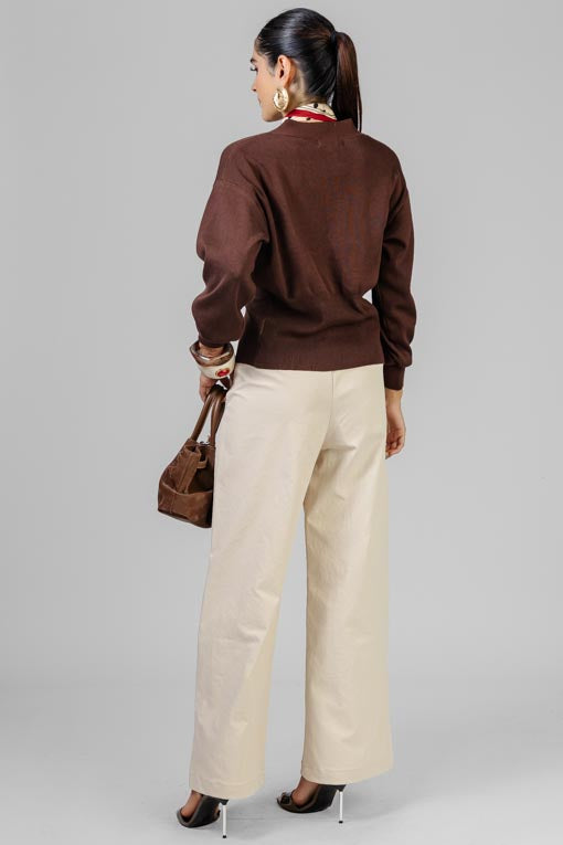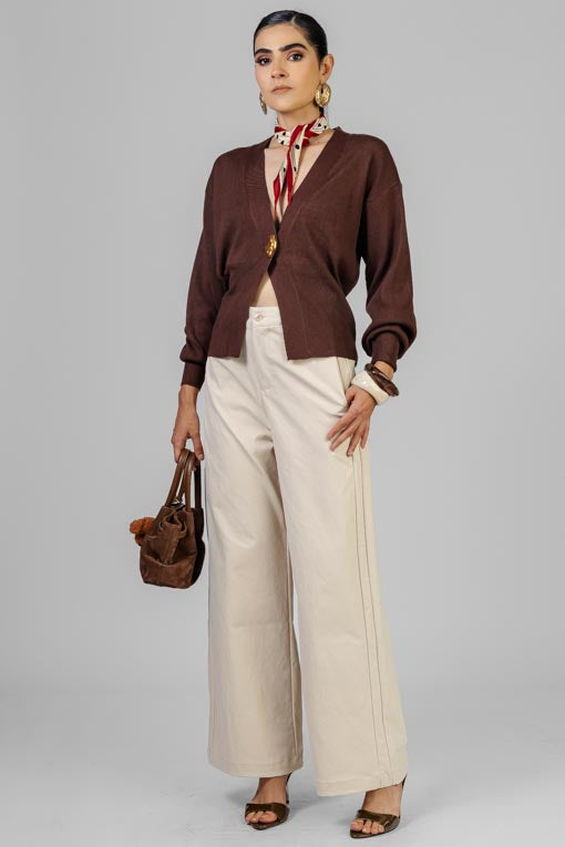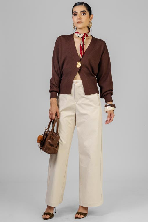 Blusa tejido ligero, escote profundo, botón al frente, manga larga, corte bajo recto