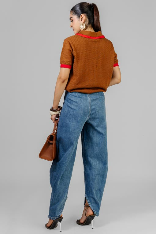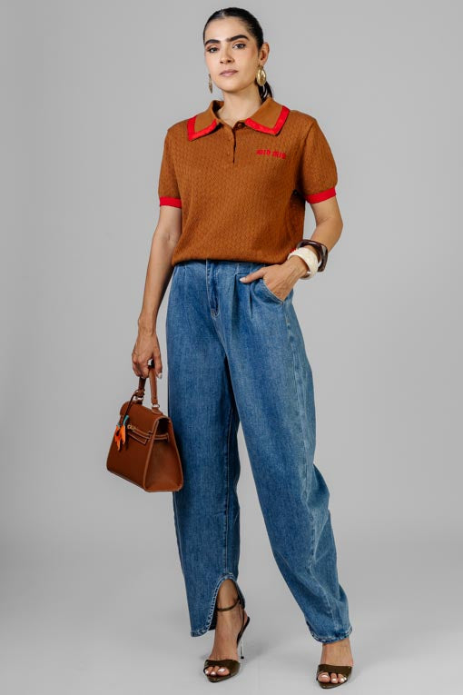 Blusa tejido ligero, cuello y aletilla,manga corta, corte bajo recto