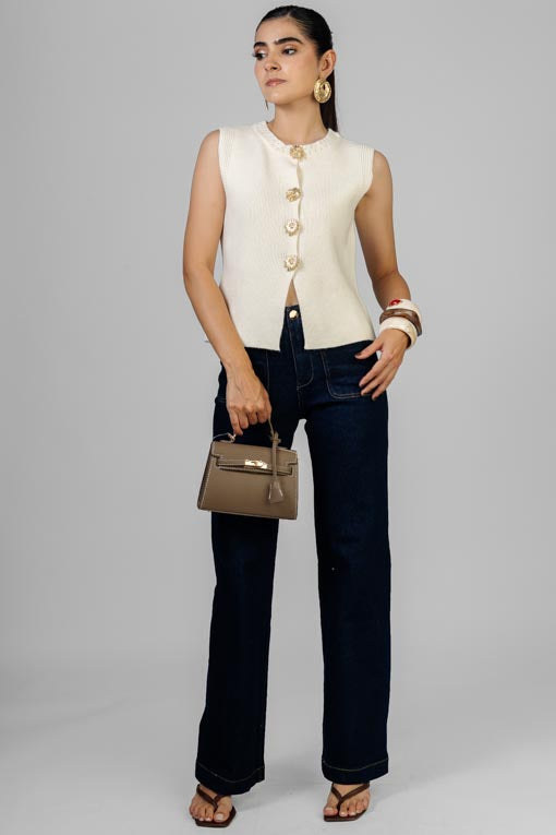 Blusa tejido, escote redondo, botones al frente, corte bajo recto