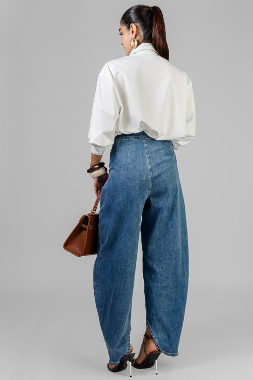 Camisa corte oversize, cuello americano, botones es forma de flor, manga larga, corte bajo recto