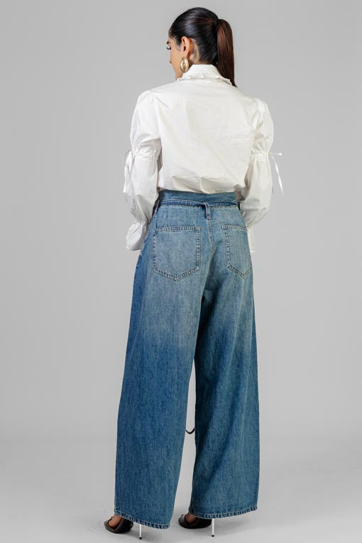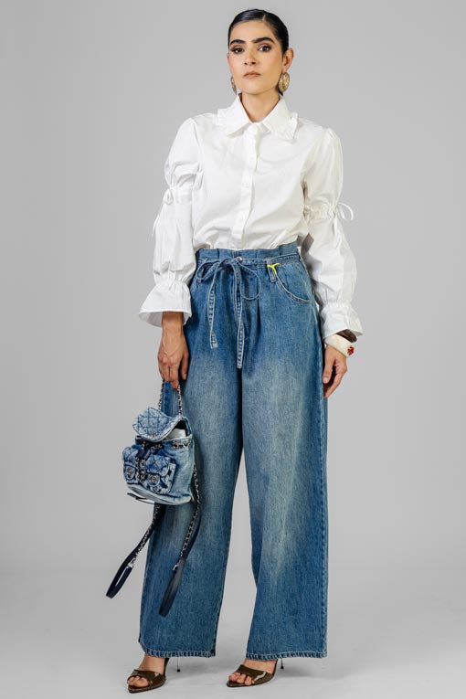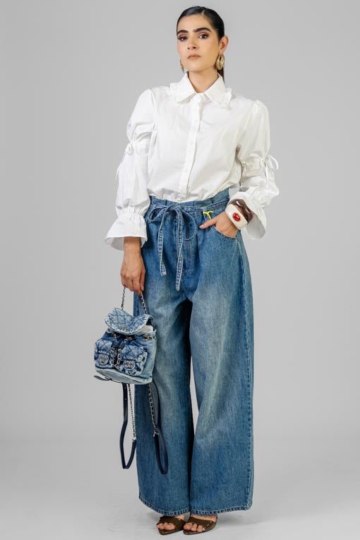 Camisa algodón cuello bebé, botones al frente, manga larga con élastico y jaretas, corte bajo recto