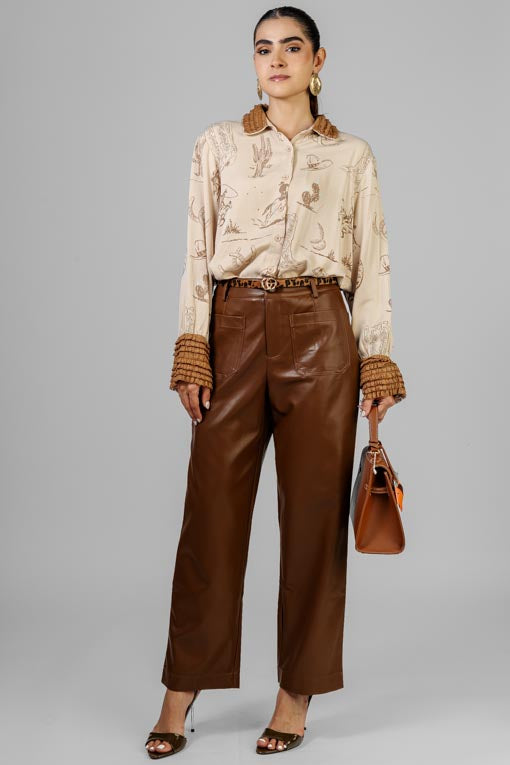 Camisa cuello americano, botones al frente, manga larga con detalle en puños, corte bajo recto