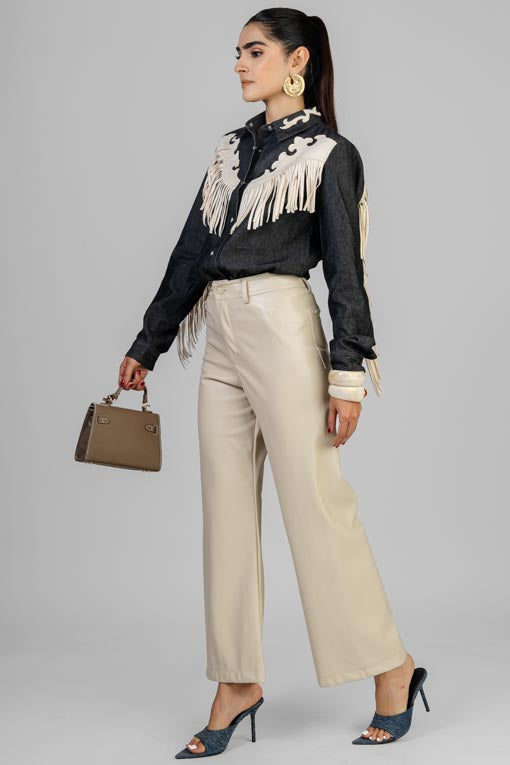 Camisa mezclilla suave, cuello americano, botones de presión y detalles de aplicaciones y flecos al frente, manga larga, corte bajo recto