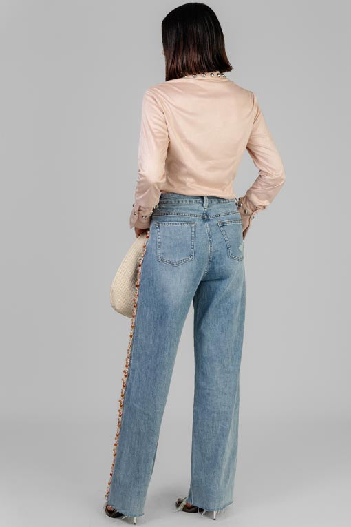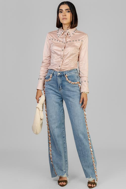 Camisa rosa nude un tono sueva y femenino, tiene cuello amplio tipo camisero decorado con aplicaciones metálicas plateadas tipo tachuelas que le dan un toque moderno y glam. En la parte del pecho presenta un diseño en forma de V estilo western, también adornado con las mismas tachuelas metálicas.
