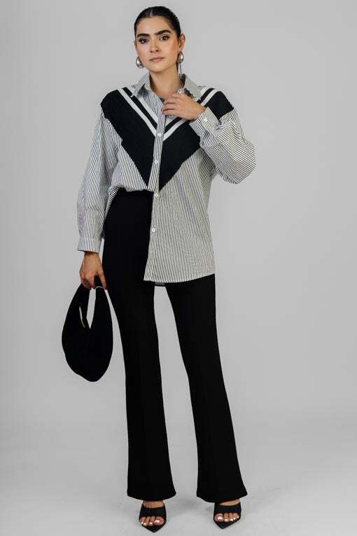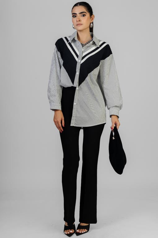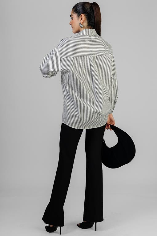 Camisa corte oversize, cuello americano, botones al frente, manga larga, detalle de franjas de punto al frente