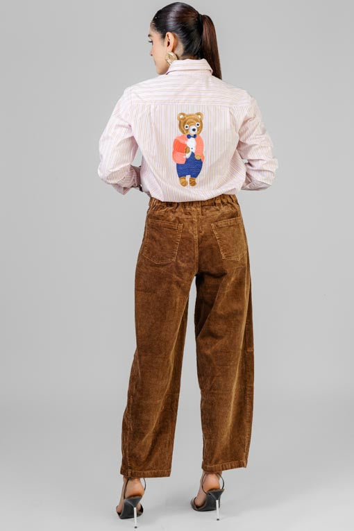 Camisa cuello americano, botones al frente, manga larga, detalle de bordados