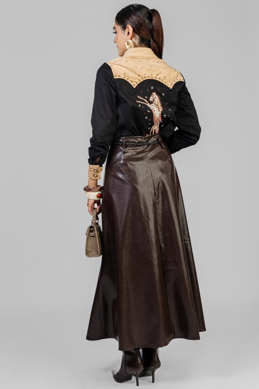 Camisa corte vaquero, cuello americano, botones de pedrería, detalle de bordados por la espalda, corte bajo recto