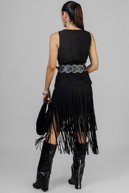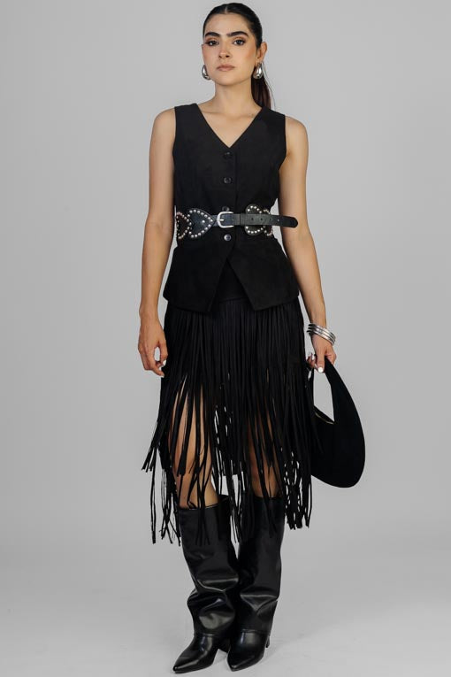 Chaleco tipo gamuza, botones al frente, sisa recta, bolsillos falsos