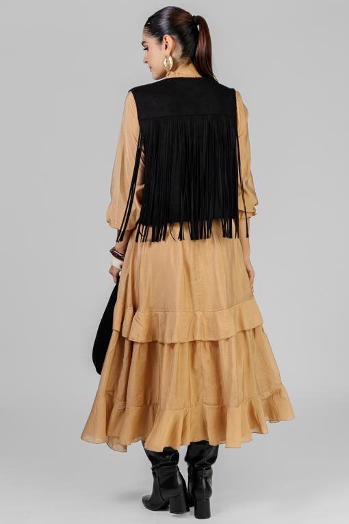 Chaleco escote redondo, sisa recta, detalle de flecos por el frente y espalda, corte bajo recto