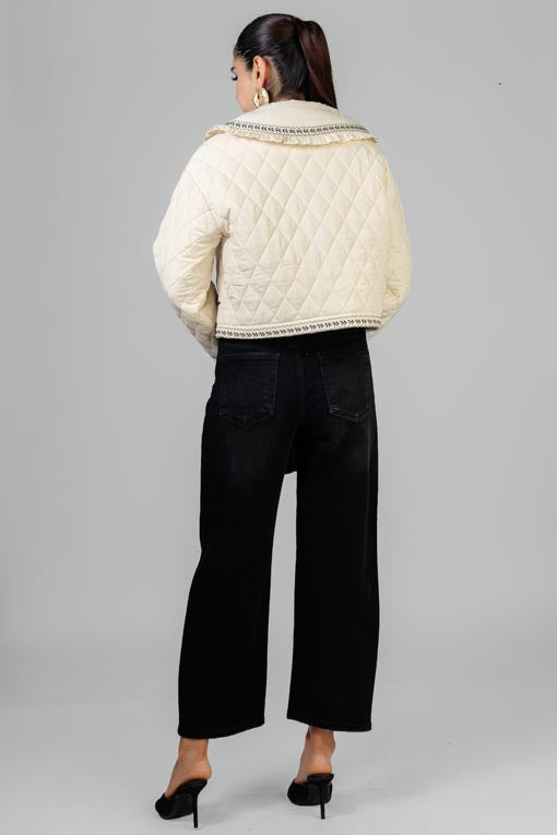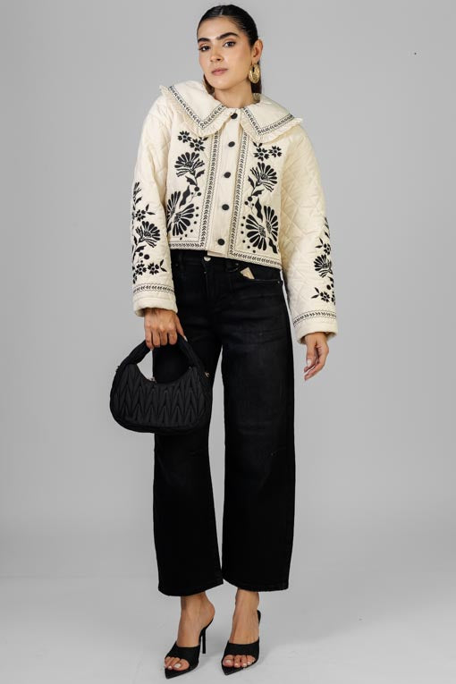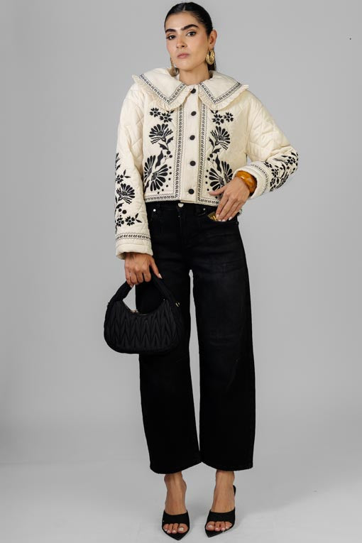 Chamarra cuello plano, botones al frente, manga larga, detalle de bordados