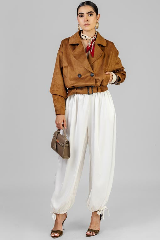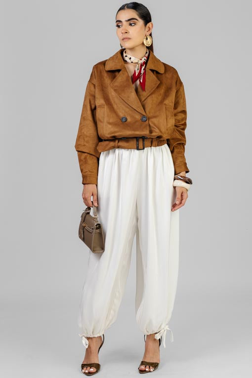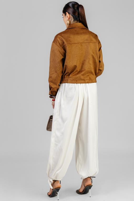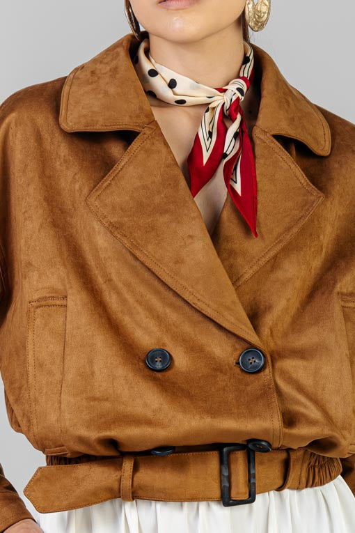 Chamarra cuello y solapa, manga larga con puños, botones al frente, corte bajo con elástico