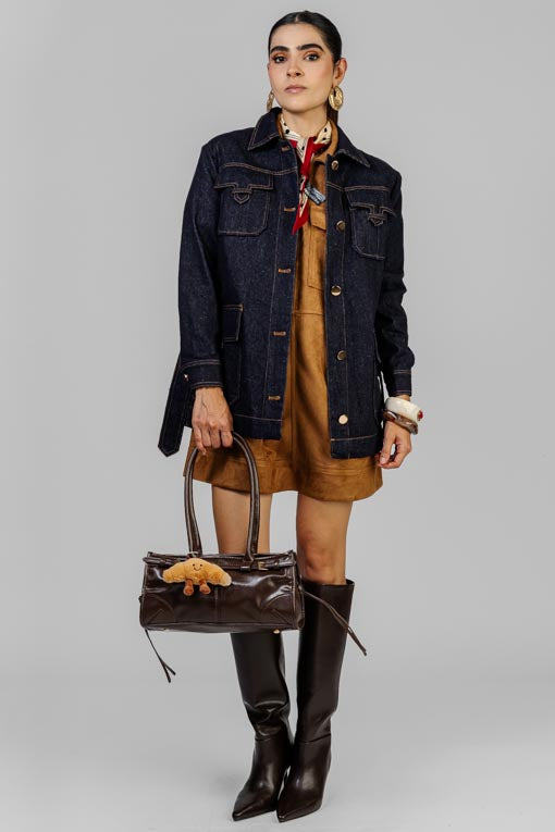 Chaqueta mezclilla cuello botones al frente, bolsas de parche, manga larga, corte bajo recto