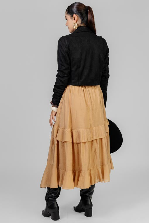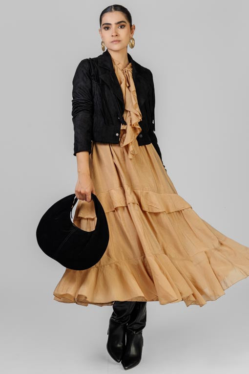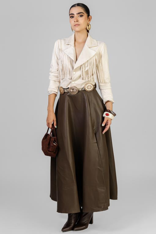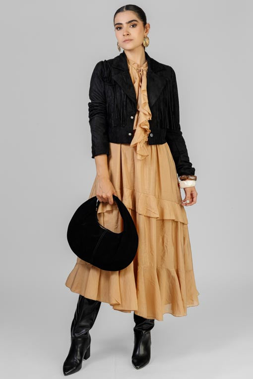 Chaqueta cuello y solapa, botones al frente, manga larga, detalle de flecos al frente, corte bajo recto