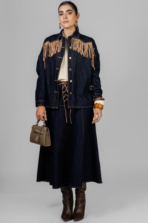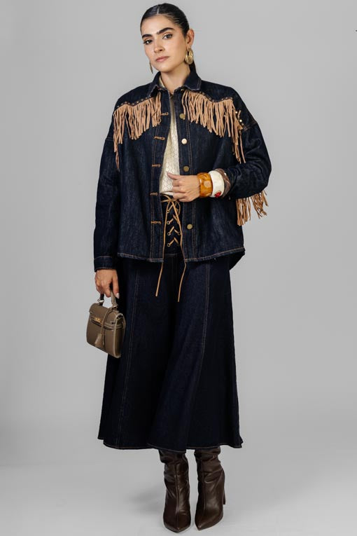 Chaqueta mezclilla delgada, cuello americano, botones al frente, detalle de tachuelas y flecos, manga larga