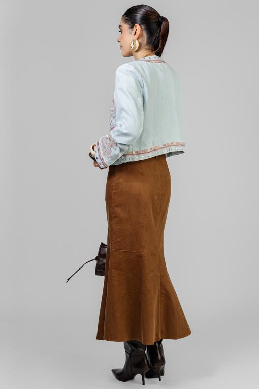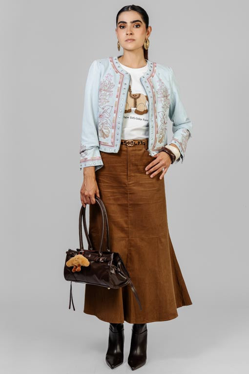 Chaqueta mezclilla delgada, escote redondo, cierre al frente, detalle de bordados y estoperoles