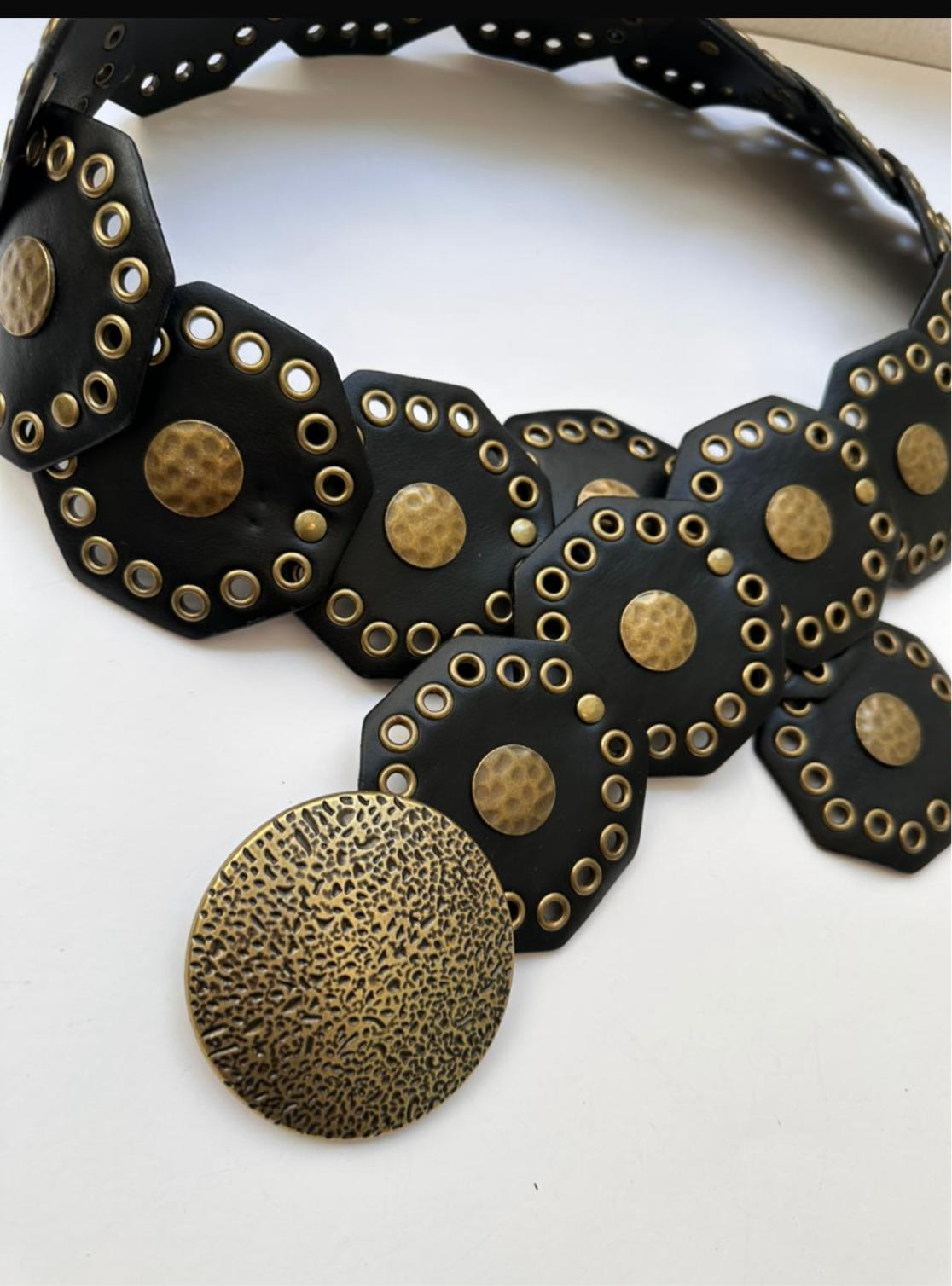 Cinto negro con monedas y trouqelado, hebilla en circulo