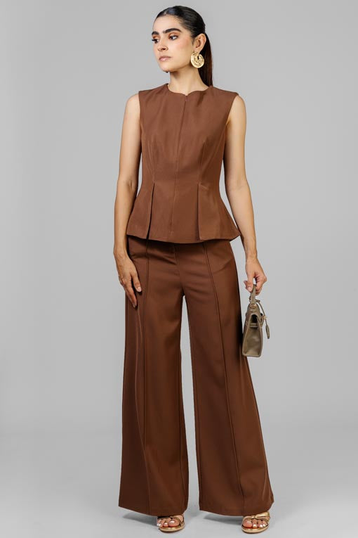 Conjunto blusa escote redondo, detalle de cierre y aberturas al frente, sisa recta, pantalón pretina lisa, cierre y botón, bolsas laterales, corte bajo recto