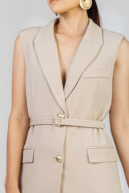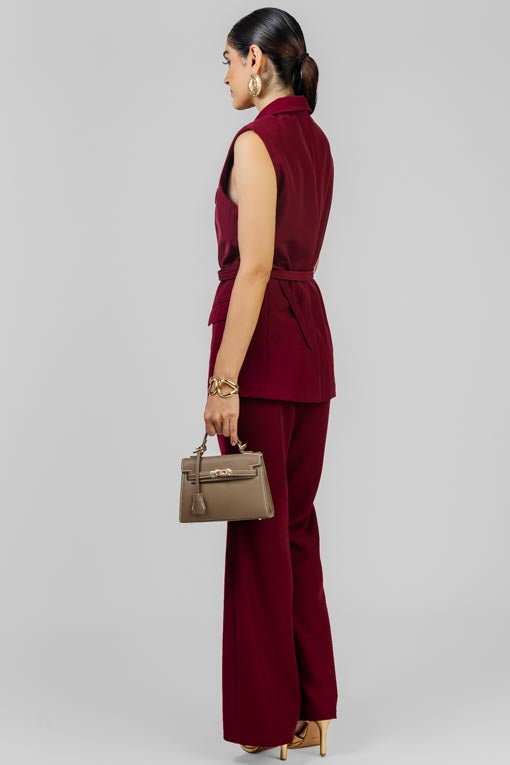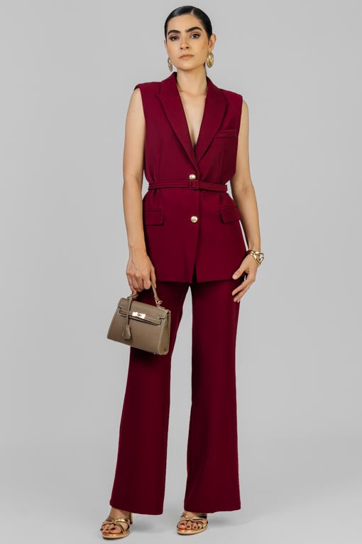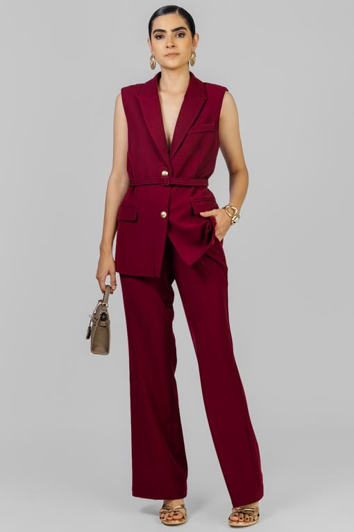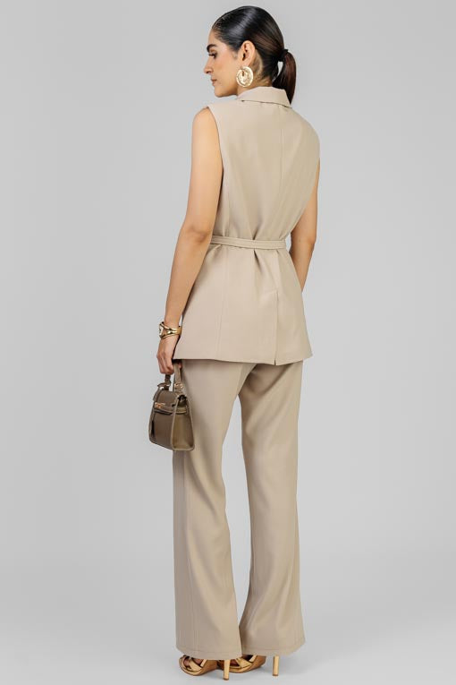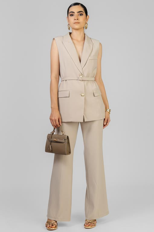 Conjunto chaleco corte sastre, cuello y solapa botones al frente y cinto en cintura. Pantalón pretina lisa, cierre y botón, bolsas laterales
