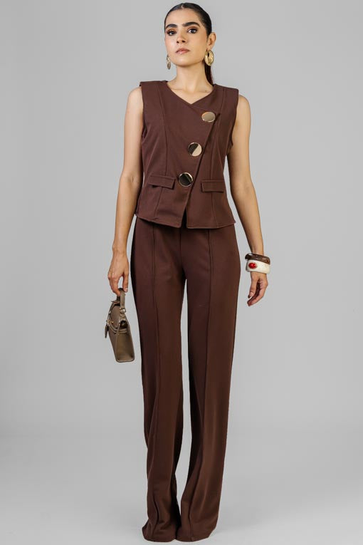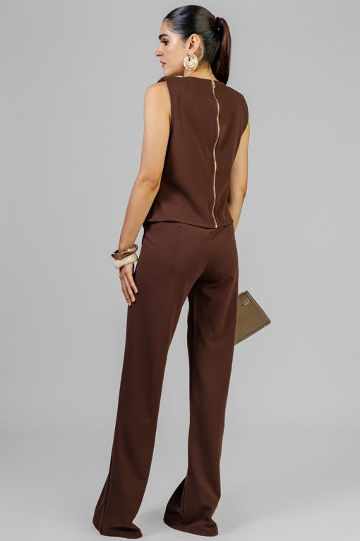 Conjunto blusa entallada, cierre por la espalda, botones decorativos al frente, pantalón cintura alta, cierre por la espalda, pretina lisa, corte bajo recto