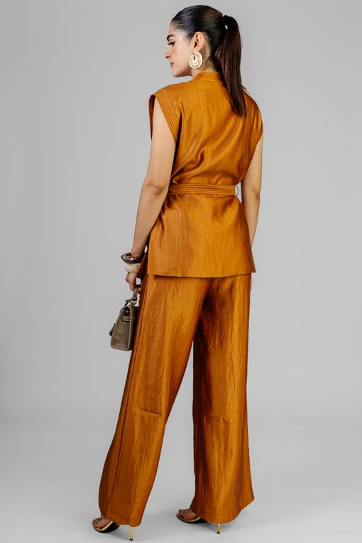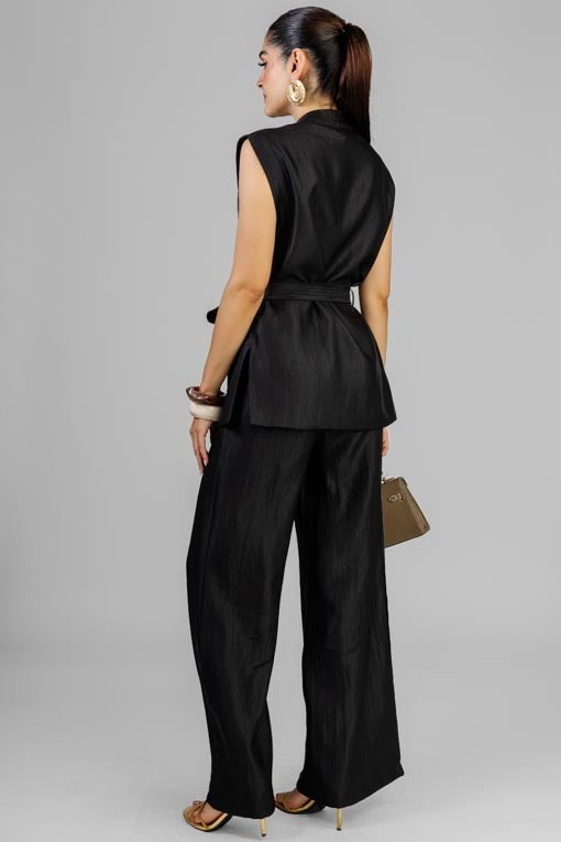 Conjunto chaleco escote redondo, botones al frente, aberturas laterales, pantalón cintura alta, cierre y botón al frente, elástico por la espalda, bolsas laterales, corte bajo recto