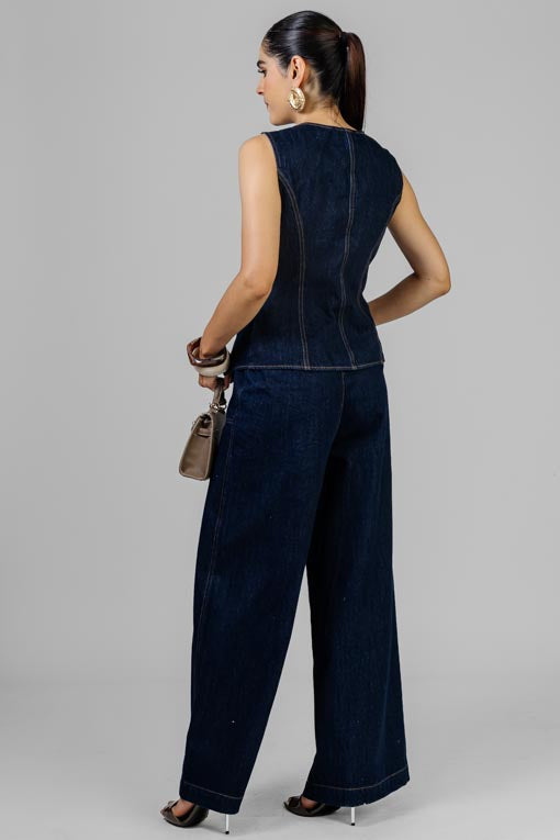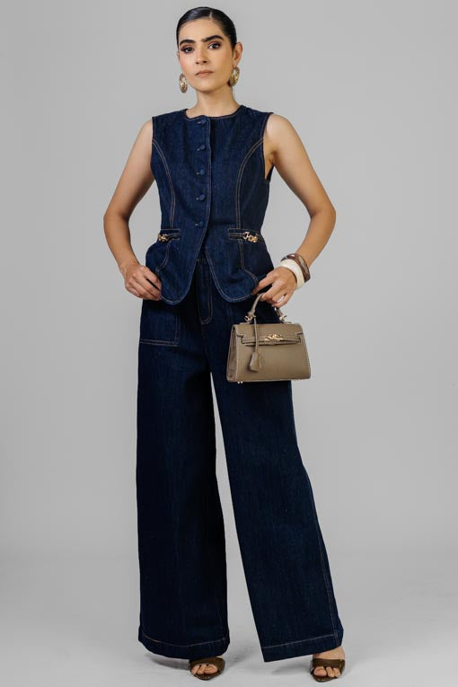 Conjunto chaleco escote redondo, sisa recta, detalle de bolsillos falsos con cadenas, pantalón cintura alta, cierre y broche al frente, pretina lisa con detalles de cadena al costado, bolsas de parche, corte bajo recto