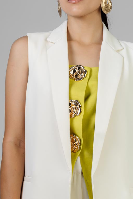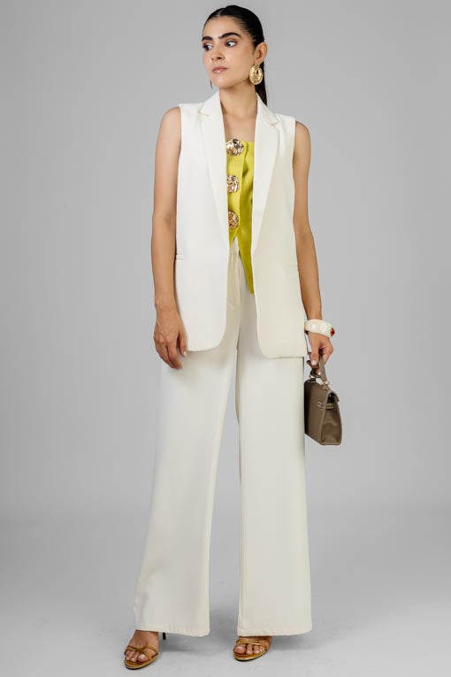 Conjunto chaleco cuello y solapa, sisa recta, bolsillos falsos, pantalón cintura alta, cierre y botón al frente y elástico por la espalda, bolsas al costado, corte bajo recto