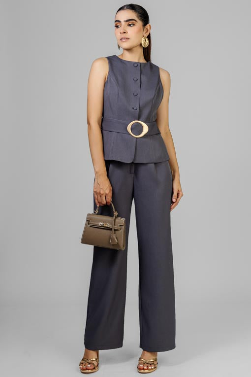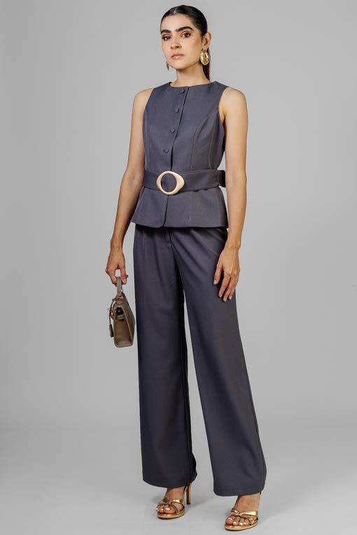 Conjunto chaleco escote redondo, sisa recta, botones al frente, pantalón pretina lisa, cierre y botón al frente, corte bajo recto