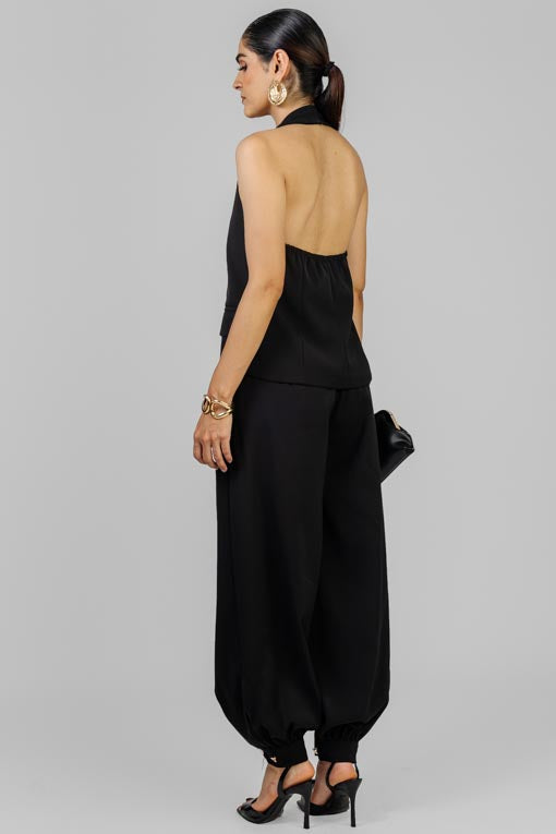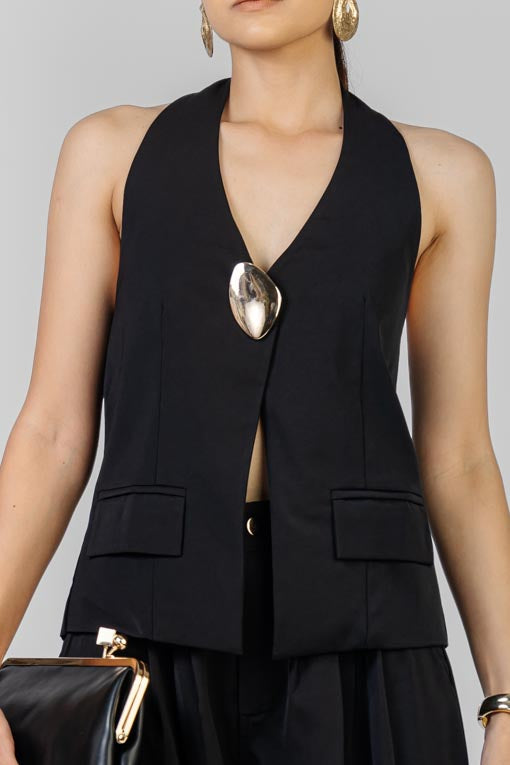 Conjunto de dos piezas, chaleco de corte sastre con escote profundo y bolsillos decorativos, acompañado de un pantalón de tiro alto con pliegues frontales que portan volumetn y caída elegante
