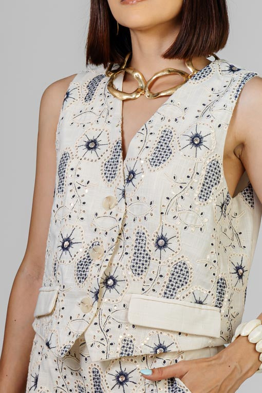 Conjunto con aire sofisticado. Chaleco estrcturado con bordado tipo artesanal que aporta textura y carácter, escote en V que estiliza y botones al frente que lo hacen versátil para usa abierto o cerrado. El pantalón de corte recto y tiro alto alargaa la figura y mantiene una caída limpia y elegantge, cintura con elástico por la espalda, cierre y botón al frente, bolsas laterales, corte bajo recto