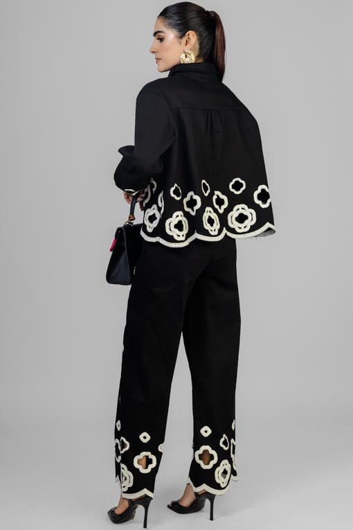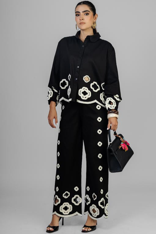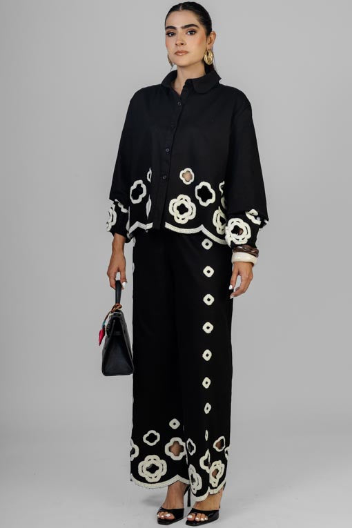 Conjunto blusa cuello americano, botones al frente, manga larga con elástico en puños, detalles en crochet, pantalón cierre y botón al frente y elástico por la espalda, corte bajo con los mismos detalles de crochet