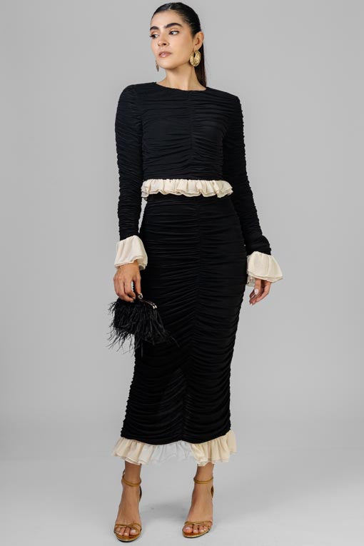 Conjunto blusa y falda, detalle de frunces en cuerpo, blusa escote redondo, cierre por la espalda, manga larga, corte bajo con olán. Falda corte recto, cintura con elástico