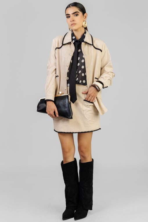 Conjunto camisa larga cuello con ribete bordado, botones y bolsas al frente, manga larga con puños, falda cierre a un costado, bolsas al frente