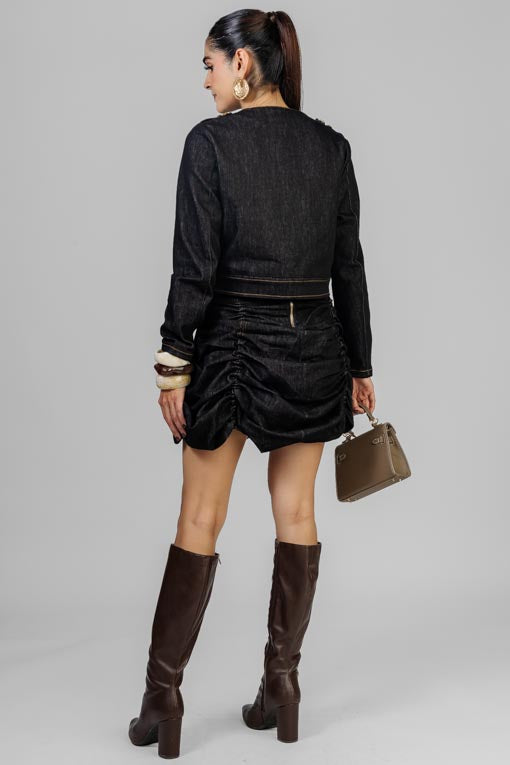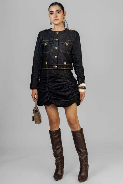 Conjunto chaqueta botones dorados, con bolsillos, falda con diseño fruncido, cierre por la espalda, peto entallado por el frente