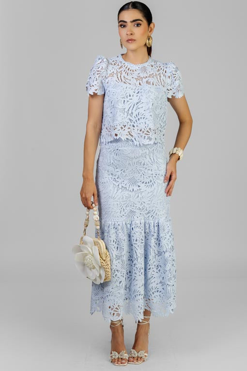 Conjunto de dos piezas en encaje de alto relieve. Top corte de manga corta con cuello cerrado y terminación recta, aporta estructura y limpieza visual. Falda de tiro alto con pretina lisa al frente, cierre y elástico por la espalda.