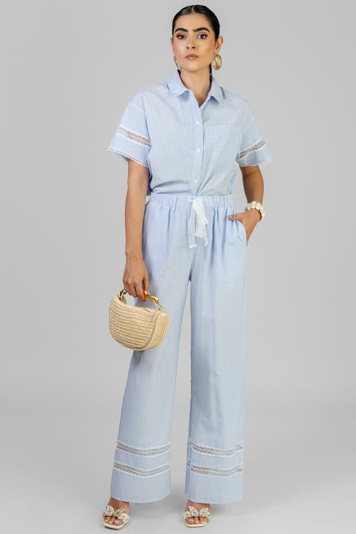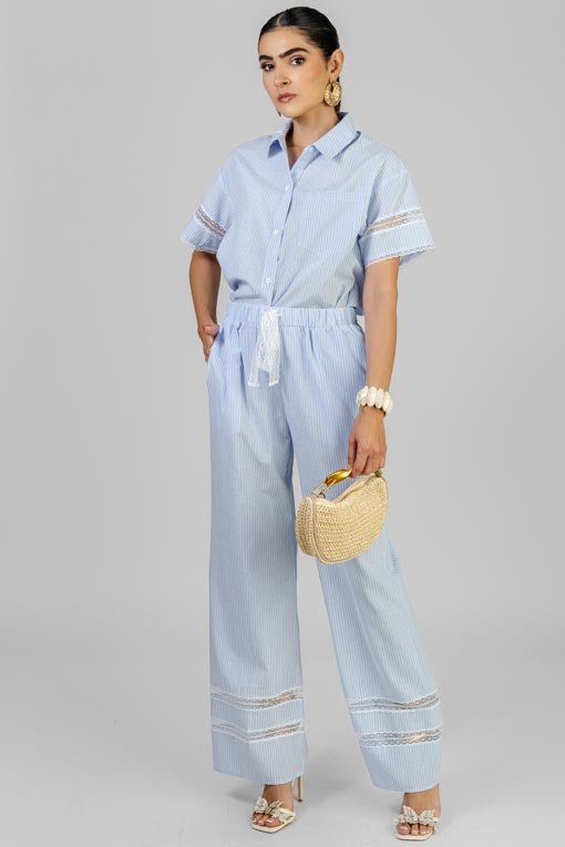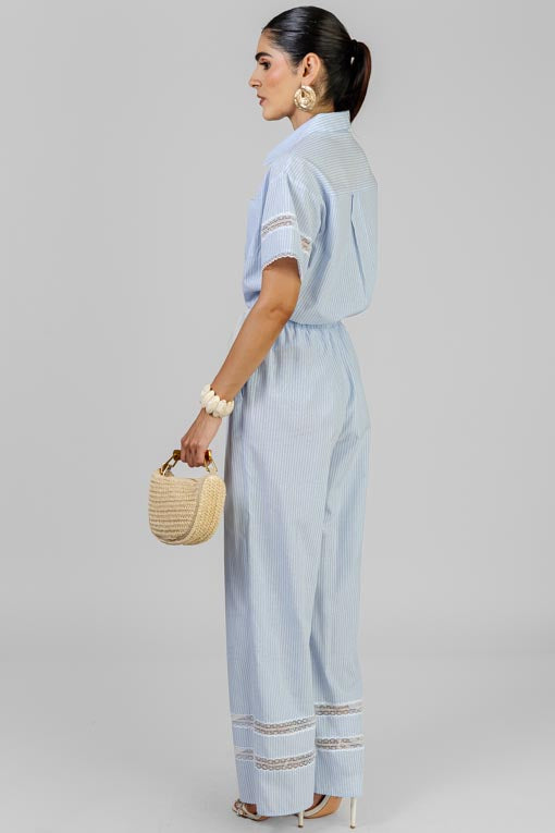 Conjunto de dos piezas con estética fresca y pulida. Camisa de manga corta con cuello clásico, botonadura frontal y delicados detalles de encaje que elévan el diseño. Pantalón de tiro alto y pierna recta, con cintura cómoda y aplicaciones de encaje que aportanun toque femenino y cuidado