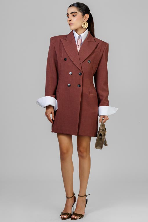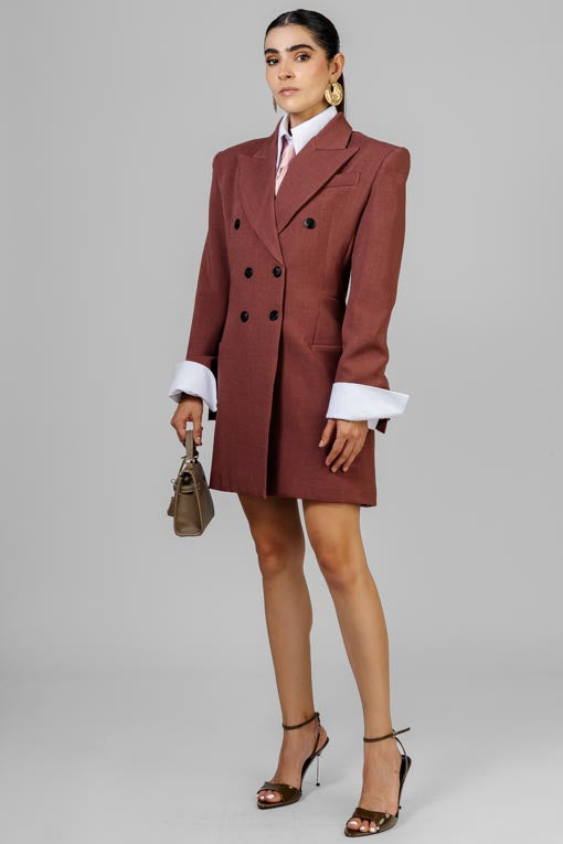 Conjunto camisero largo con cuello y manga larga, botones al frente. Vestido con cuello y solapa, manga larga, botones al frente, corbata incluida